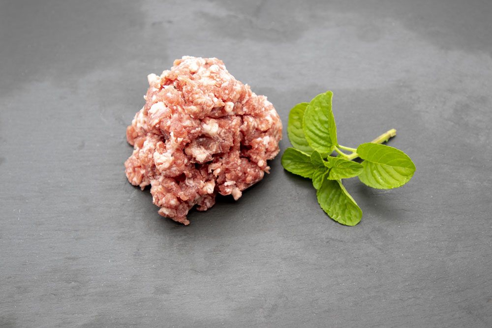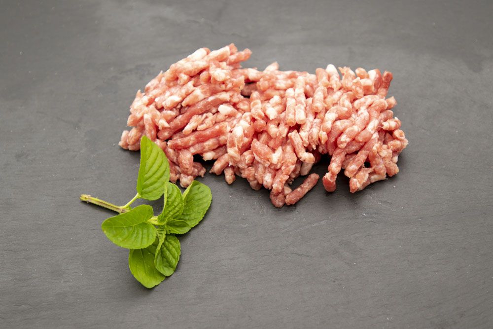 Picado de magro de cerdo ibérico sin aliñar. Se presenta en bandejas termosellada con atmósfera controlada. Peso máximo de la bandeja 650 gramos.